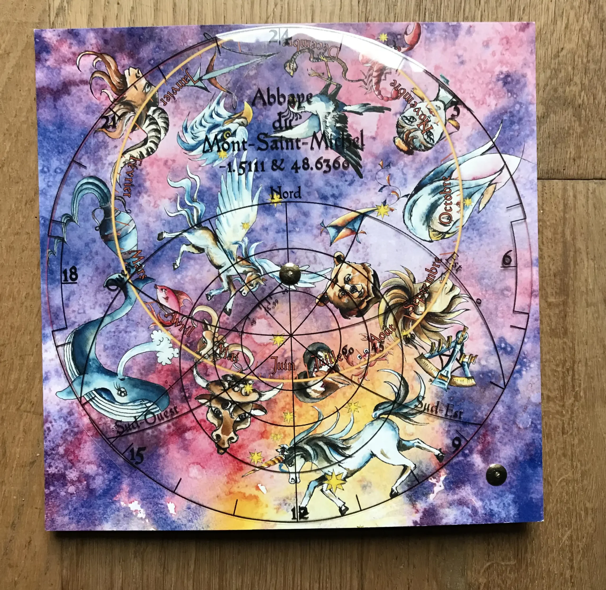 J’ai créé un astrolabe pour les enfants de A à Z. Je l’ai voulu conforme d’un point de vue scientifique, dans une approximation raisonnable pour préserver son esthétique et sa facilité d’utilisation (seul Pégase sort exagérément de son champ bien qu’il y garde les sabots…). L’astrolabe est un instrument ancien de repère sur la voûte céleste, il permet d’illustrer le mouvement des constellations relativement à notre position sur Terre. Puisse-t-il donner aux enfants le goût de la découverte de tout ce qui nous dépasse. Une citation de Carlo Rovelli, scientifique de renom, ceinture l’arrière de l’astrolabe pour rappeler que la réalité se révèle plus proche du conte de fée que de cette apparente et illusoire mécanique des astres.